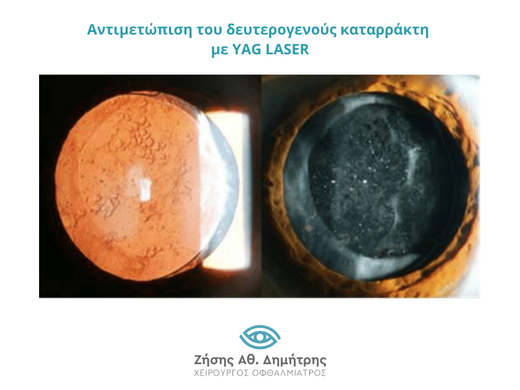 Ο δευτερογενής καταρράκτης αντιμετωπίζεται γρήγορα και ανώδυνα, μέσα σε λίγα δευτερόλεπτα με τη χρήση του YAG Laser, μέσω μίας διαδικασίας που ονομάζεται καψουλοτομή. Με την εφαρμογή του λέιζερ δημιουργείται μία δίοδος στο οπίσθιο περιφάκιο, αυτό που θόλωσε λόγω του πολλαπλασιασμού των κυττάρων του κρυσταλλοειδούς φακού, με σκοπό να βελτιωθεί η όραση του ασθενούς.