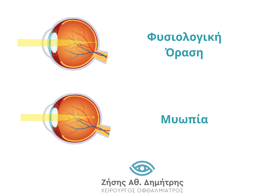Η μυωπία συνήθως εμφανίζεται όταν το αξονικό μήκος του ματιού είναι μεγαλύτερο από το φυσιολογικό ή όταν ο κερατοειδής ή ο φακός του ματιού έχουν μεγαλύτερη διαθλαστική δύναμη από το φυσιολογικό. Έτσι το φως, αντί να εστιάζεται ακριβώς στον αμφιβληστροειδή, εστιάζεται μπροστά από τον αμφιβληστροειδή, με αποτέλεσμα να εμφανίζεται μια θολή εικόνα για τα μακρινά αντικείμενα.